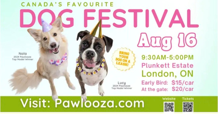 Join us for Pawlooza @ the Plunket Estate, just west of London, Ontario, 9282 Elviage Dr., London, ON N6K 4N5 9:30-5 pm, Saturday, August 16, 2025